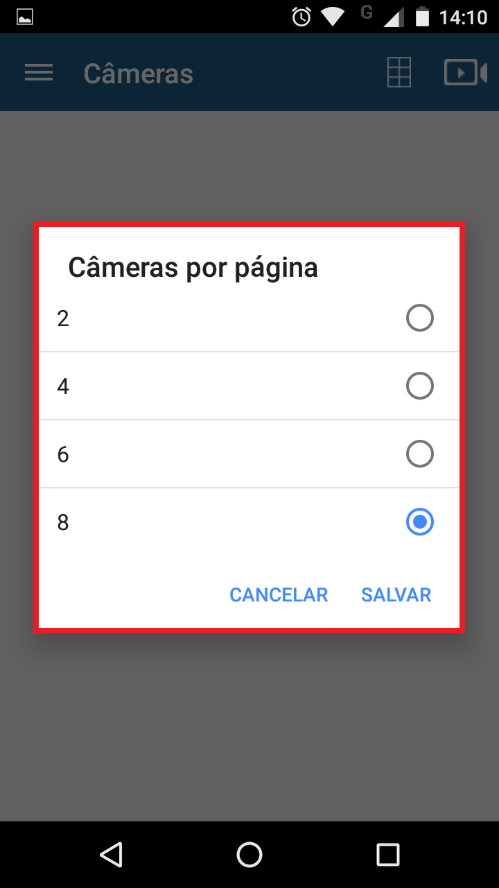 5 – A próxima tela será “Câmeras”. No ícone da grade é possível escolher quantas câmeras serão abertas na abertura desse servidor através do APP. Já no ícone da câmera é possível escolher quais serão as câmeras que aparecerão: